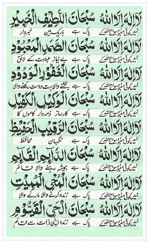 LA ILAHA ILLAL LAHO SUBHAN AL ALEEM IL HAKEEMLA ILAHA ILLAL LAHO SUBHAN AS SATTAR IL GHAFAAR